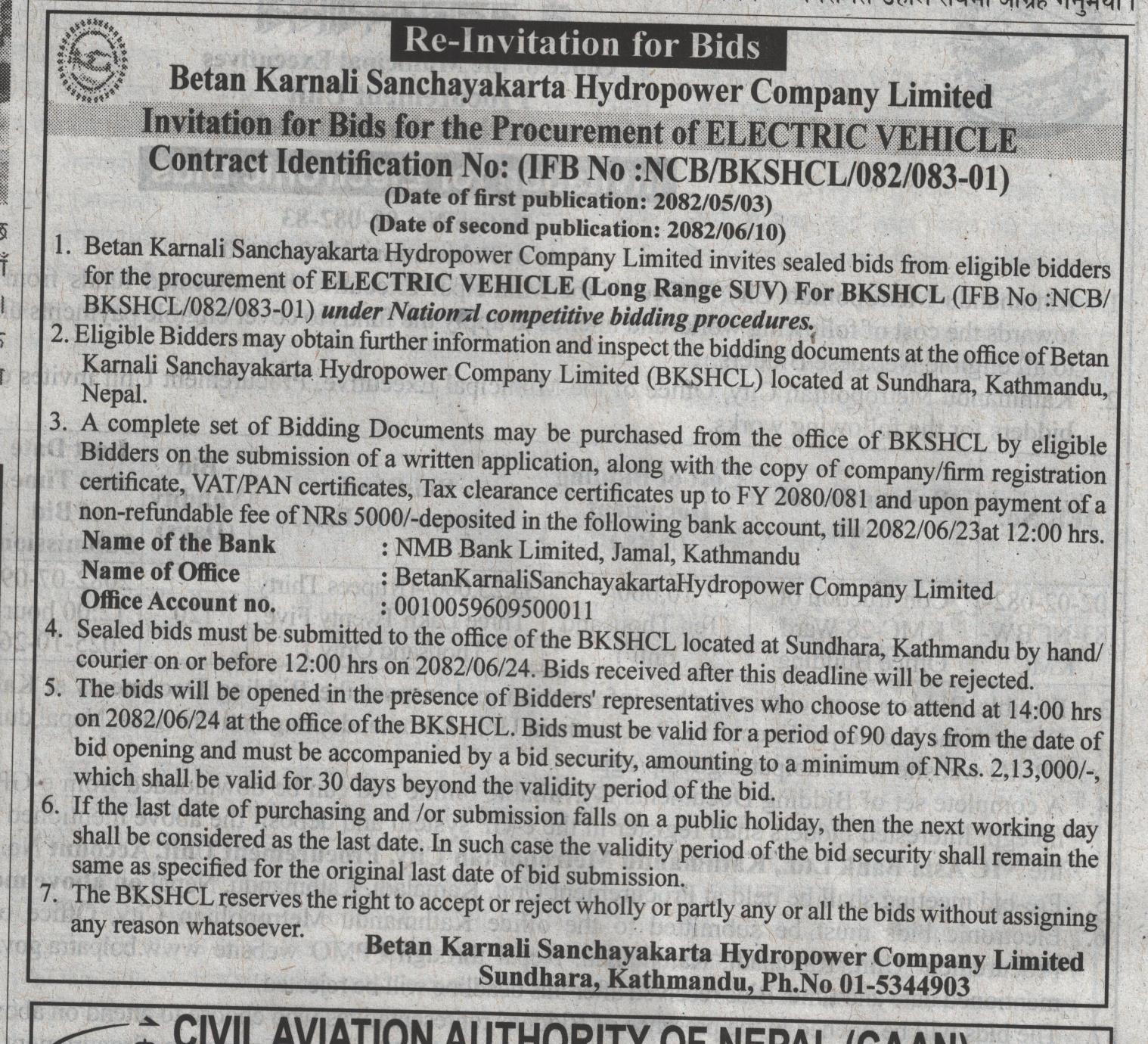 Date of Publication: June 6, 2020 - बेतन कर्णाली सञ्चयकर्ता हाइड्रोपावर कम्पनी लिमिटेडलाई आवश्यक सवारीसाधन खरिद गर्ने सम्बन्धी सिलबन्दी बोलपत्र आह्वानको सूचना [NCB/BKSHCL/BKHEP/076/77 BD-05]
